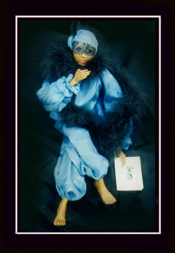 Mardi Gras Masquerade is a collection of African American Mardi Gras Dolls. This African American doll has a Mardi Gras mask painted face. Costume is made of Blue silk material with black feathers. (Note: fabric colors may vary slightly depending on availability). The hands and feet are hand-sculpted with precise detail. Her wig is made of black strands of mohair. One of the dolls distinct features is her bare feet. JoAnn's unique body design allows this Mardi Gras Doll to be positioned in various ways by bending her arms at the elbow joints and by bending her legs at the knee joints. This feature adds to the life-like quality of the piece. Accompanying the character doll is a booklet and display card designed by JoAnn to include; the number of the piece, the inspirational sketch, a short bio, and a story about the character. All clay pieces are limited editions of 500. A numbered and signed Certificate of Authenticity is also provided with the character doll.
