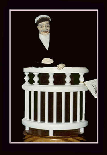 The Steamboat Captain Doll is the first character doll of the Old Man River Collection. Inspired by an actual steamboat captain that paddled down the Mississippi River in years gone by. The Steamboat Captain Doll stands 18 inches in height and is standing on a hand-crafted wooden stand designed by Brian Bernard. Brian's idea was to duplicate the hand rails of the Steamboats that churned the muddy waters of the Mighty Mississippi. He is dressed in a black woolen pea coat jacket, white turtleneck sweater and wool black pants. He wears a handmade captains hat. JoAnn's unique body design allows The Steamboat Captain to be positioned in various ways by bending his arms at the elbow joints. This feature adds to the lifelike quality of the piece. Accompanying the character doll is a booklet and display card designed by JoAnn to include; the number of the piece, the inspirational sketch, a short bio, and a story about the character. All clay pieces are limited editions of 500. A numbered and signed Certificate of Authenticity is also provided with the character doll.