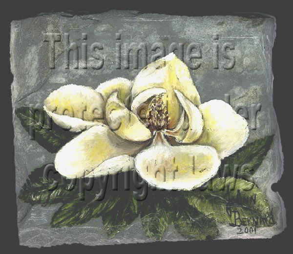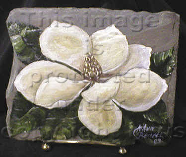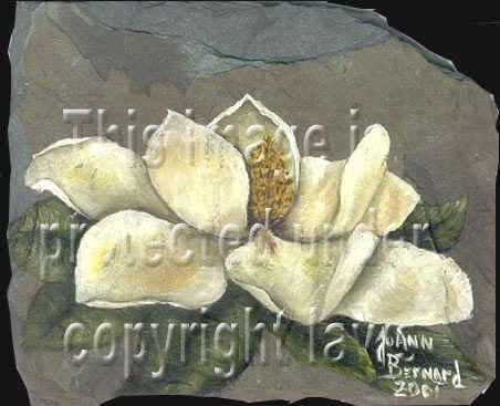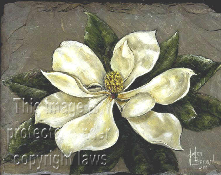 Original Magnolia Oil Paintings on authentic slates, collected from salvaged roof tops of Old New Orleans. Each hand-painted slate is a reproduction of original oil paintings by JoAnn Bernard. Each slate varies slightly from the original pattern. All are signed and dated by the Artist. No two are exactly the same. ( Photo colors of slates may differ slightly from actual slate)