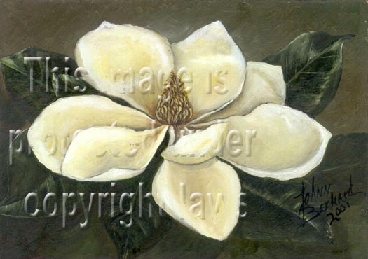 When I began painting in the 80's I purchased a kit containing a Magnolia Painting signed by Roberts. The painting instruction kit gave no credit to the artist. This painting is one of my favorites, I've changed a few pedals from the original, but this is still a Roberts original. I thank the artist for allowing learning artist to reproduce his/her work. Reproduction paintings are signed Roberts' Southern Charm by JoAnn Bernard.